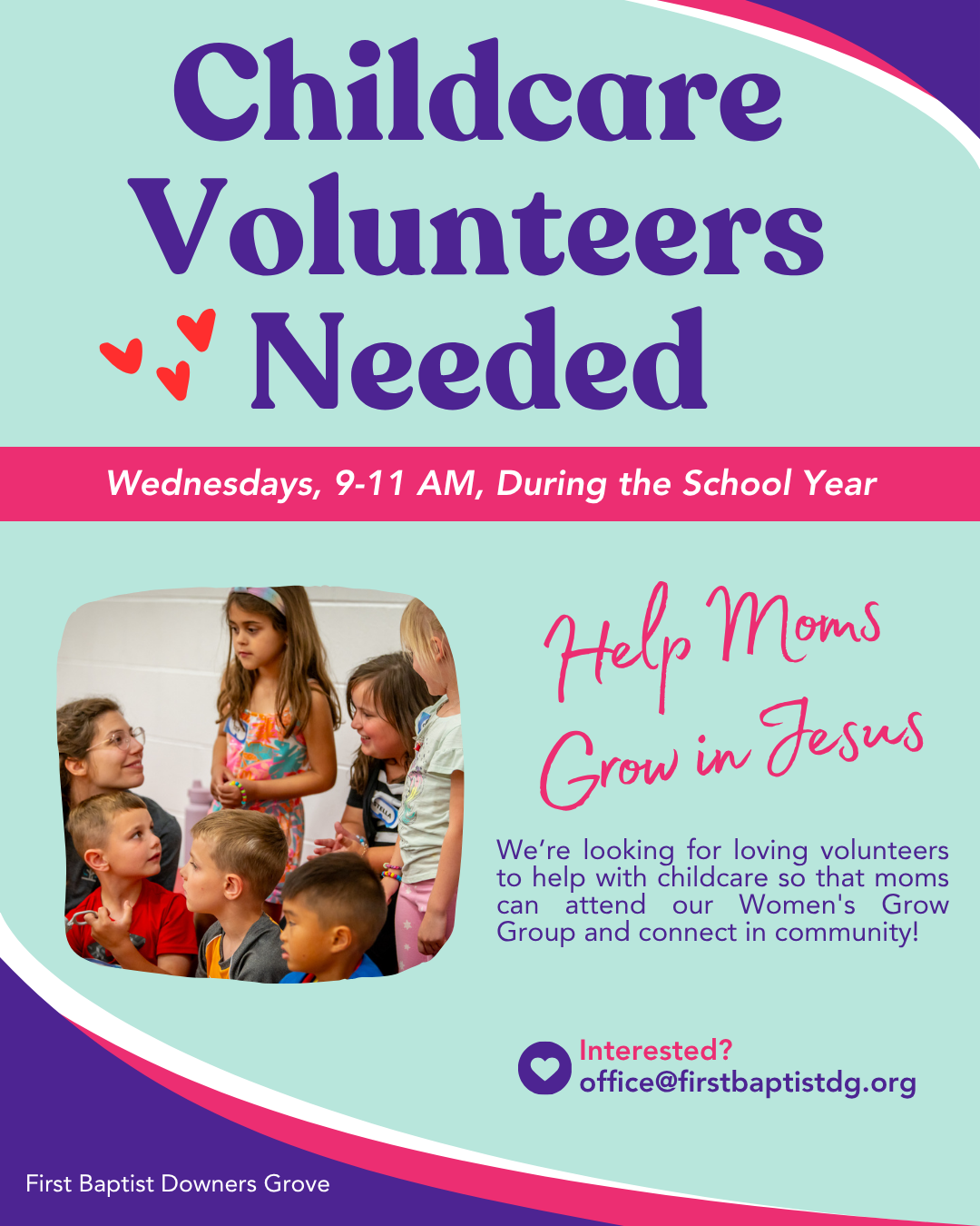 We’re looking for loving volunteers to help with childcare on Wednesdays from 9-11 AM so that moms can attend our Women's Grow Group and connect in community.